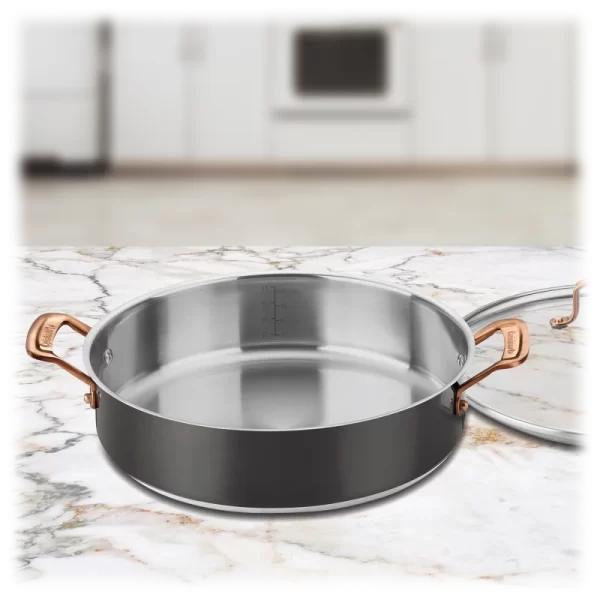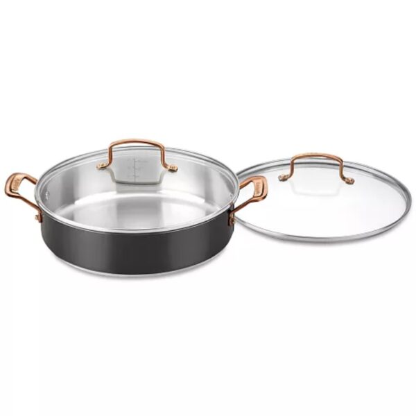 Performance takes on a stylish look in this covered casserole from Cuisinart. Underneath the sleek black and gleaming gold-tone, an aluminum-encapsulated base heats quickly and evenly for reliable results on the stove or in the oven.
