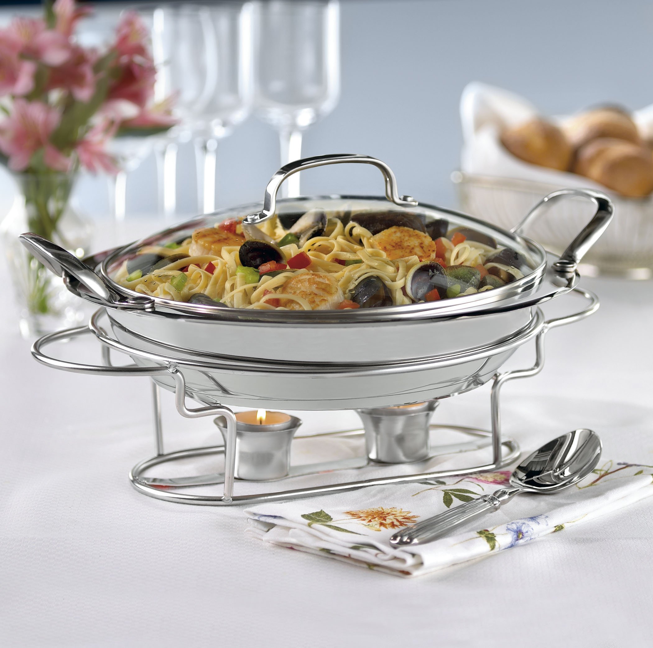 An easy and elegant way to keep your favorite party dishes warm when entertaining family and friends. The buffet pan is constructed of stainless steel with an aluminum-encapsulated base. You can prepare meals in the oven or on the stovetop and transfer them to the warming stand for immediate serving.