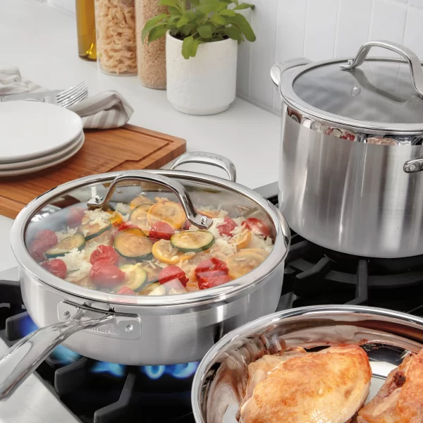 – DURABLE DESIGN: Elegant and contemporary, the professional Triple Ply Construction features a core of pure aluminum and a handsome brushed stainless finish. Heat Surround Technology allows for even heat distribution along the bottom and sidewalls of the cookware. Cookware also features Cool Grip handles secured with stainless steel rivets, self-basting and tight-fitting lids