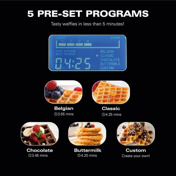 – LCD DIGITAL DISPLAY: The easy to read and use lcd digital panel makes it easy to cook waffles exactly as you would like them. Choose the right program for your desired result.