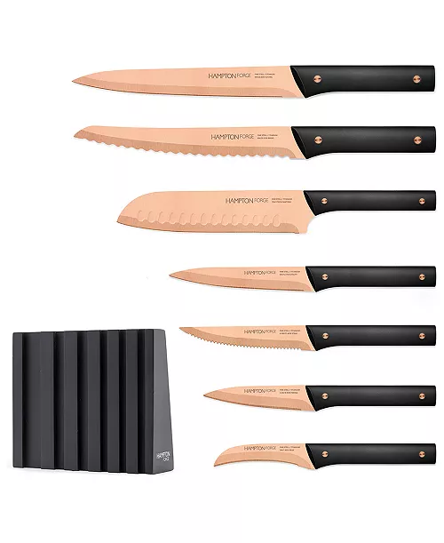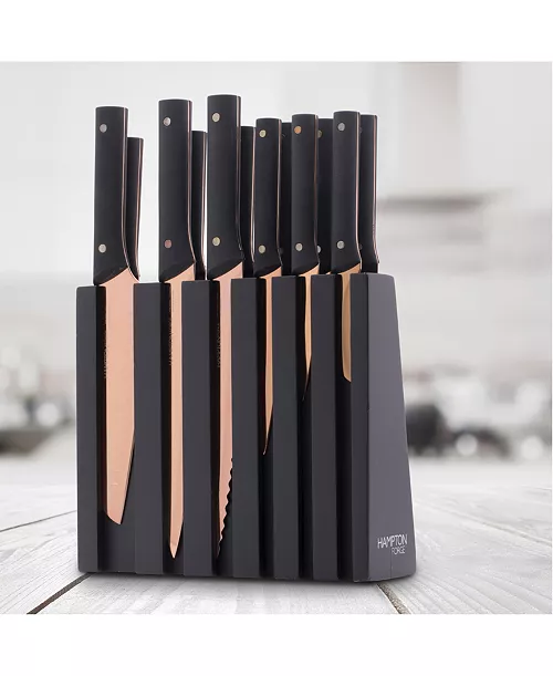 Make a statement in your kitchen while making food prep easier with this 13-piece Knight Copper cutlery block set from Hampton Forge. Titanium-plated blades provide superior slicing, chopping and cutting while the chic block stores each piece safely and in style.