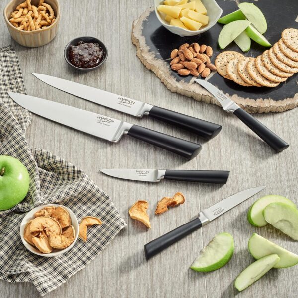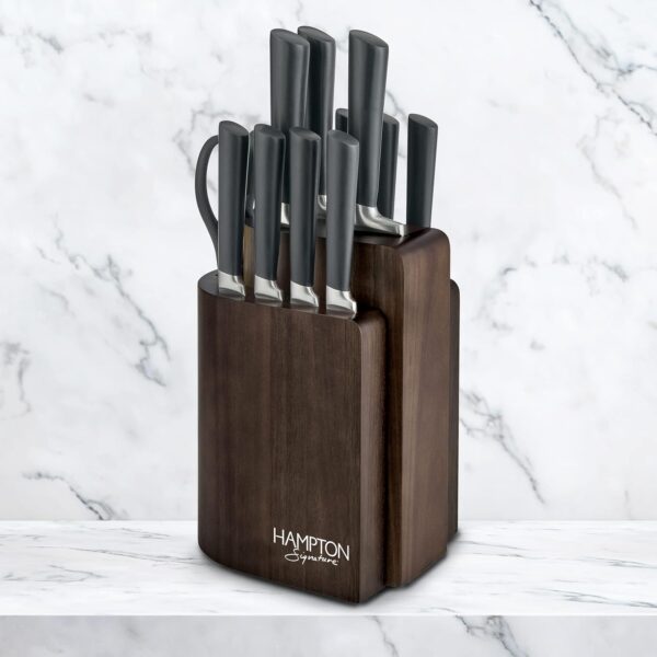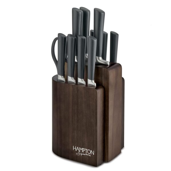 Grace your countertop with the Logan 13 Piece Cutlery Block Set by Hampton Signature. Contemporary, ergonomic, matte black handles and an ultra-innovative, detachable wood block distinguish this set of high-performance knives. Crafted from durable stainless steel with a forged construction and an ultra-sharp, taper ground, fine blade edge that stays sharper longer. Keep your knives and utensils at arm’s reach with our two-tiered, Acacia wood counter block that allows you to remove and transport only the tools you need to your prep scene
