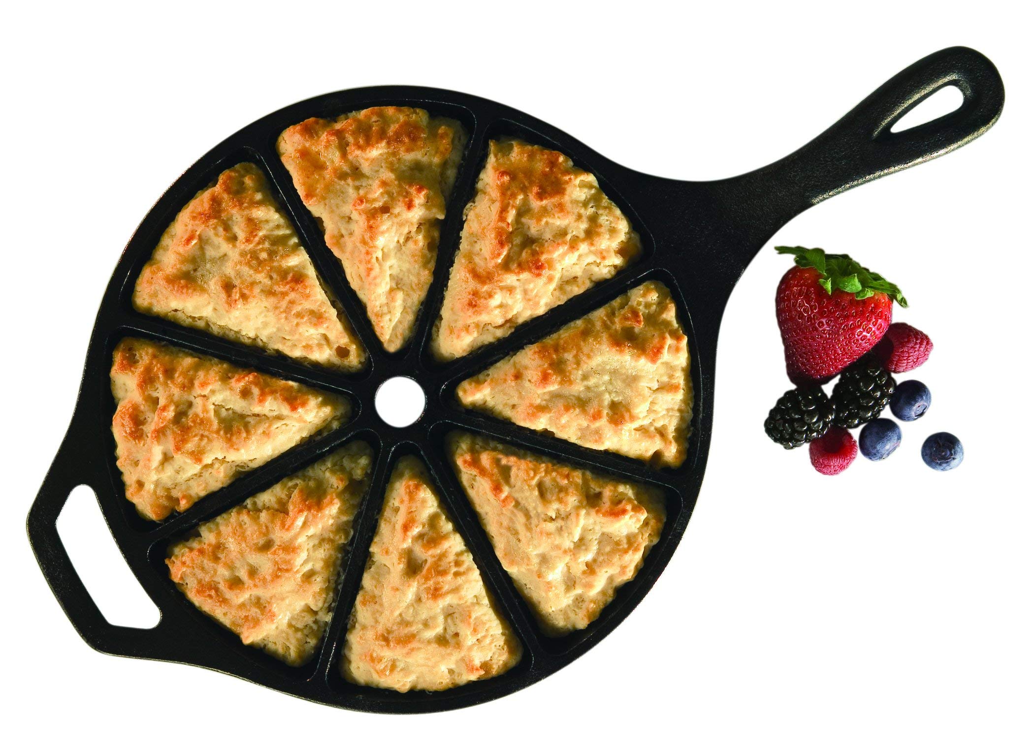 The Lodge Cast Iron Wedge Pan is a handy addition to any kitchen. It has eight impressions set into a 9″ circle. The cornbread wedge pan is designed for making all kinds of goods, from scones to brownies and more. Its design ensures that everyone gets a corner piece. This cast iron wedge pan is the right tool for baking any batter at home in the oven, on the stove, on the grill or over the campfire. It’s seasoned with oil for a natural, easy-release finish that improves with use and an unparalleled pan in heat retention and even heating. Easy care instructions include hand washing, drying, and rubbing with Lodge’s Seasoning Spray for the ideal finish. This product is made from incredibly strong metal to hold up to lots of regular use. The sections are machined to exact specifications so that every wedge comes out at a consistent size and shape. There’s a hole in the handle and one at the opposite edge for hanging on a hook.