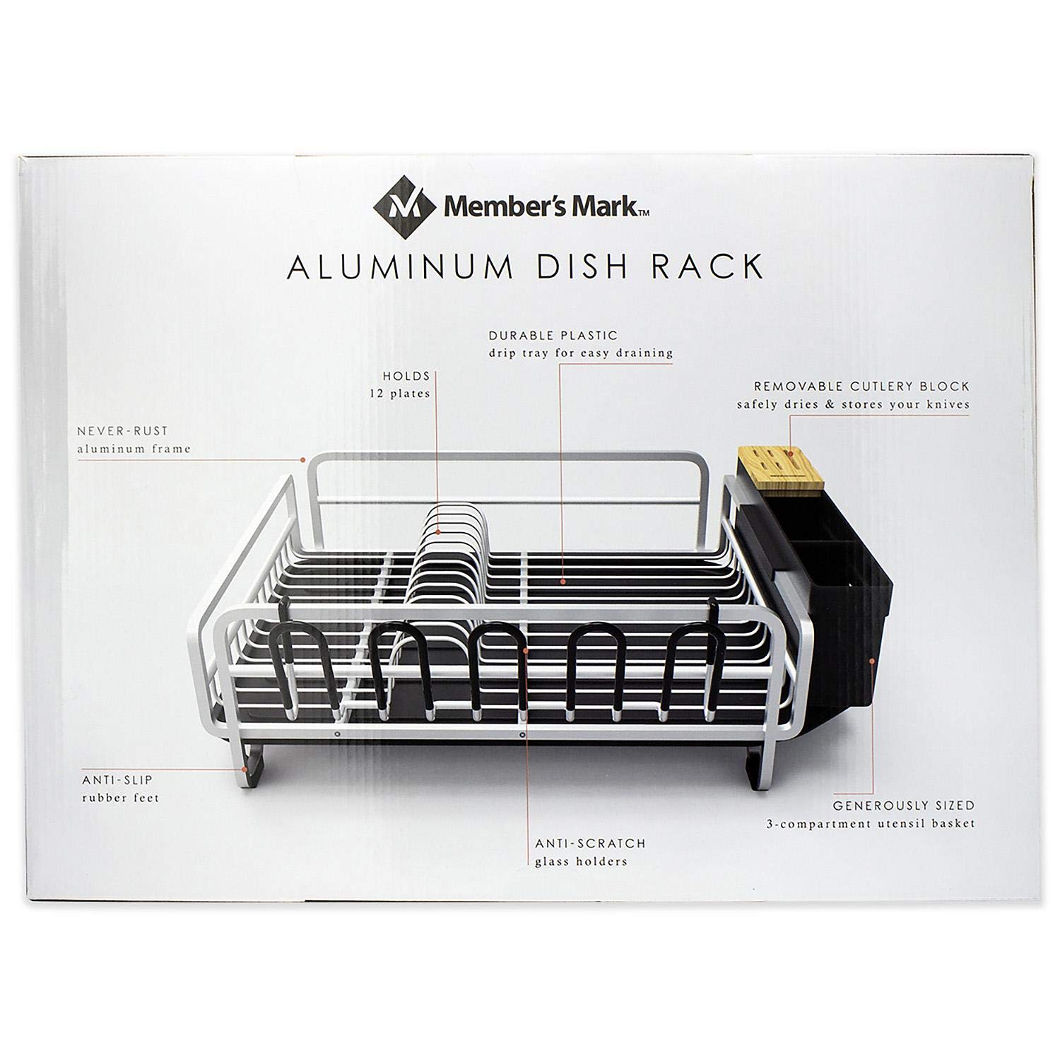 The Member’s Mark Aluminum Dish Rack is rust-free, durable, and generous in size. It comes equipped with anti-scratch glass holders, a three-compartment utensil basket, removable bamboo cutlery block and a durable plastic drip tray. Durable Strong Frame 20 x 6.9 x 13.8 Generous size Strong aluminum frame Durable plastic drip tray Anti-scratch glass holders Removable cutlery block