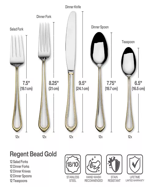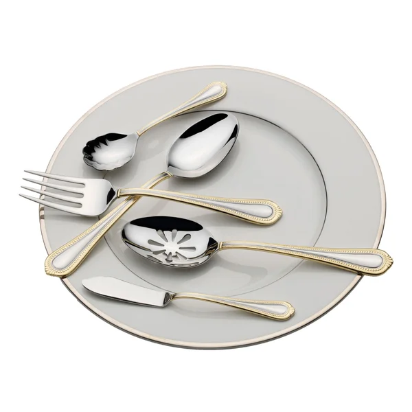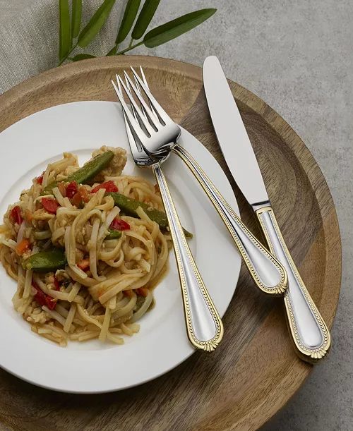 Mikasa’s Regent Bead Gold Flatware features elegant yet subtle beading that transitions beautifully from everyday meals to finer occasions. Expertly-crafted from polished, top-quality 18/10 stainless steel and accented with 24 karat gold, this pattern is designed to complement any tabletop decor.