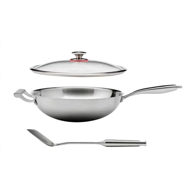 The MIU Tri-Ply Stainless Steel Wok is constructed with high quality 18/8 steel with no coating and does not contain PTFE. Constructed of 3 layers of pure steel, making for quick and even heat transfer and is ideal for deep frying, broiling, sauteing, braising and stir fries.