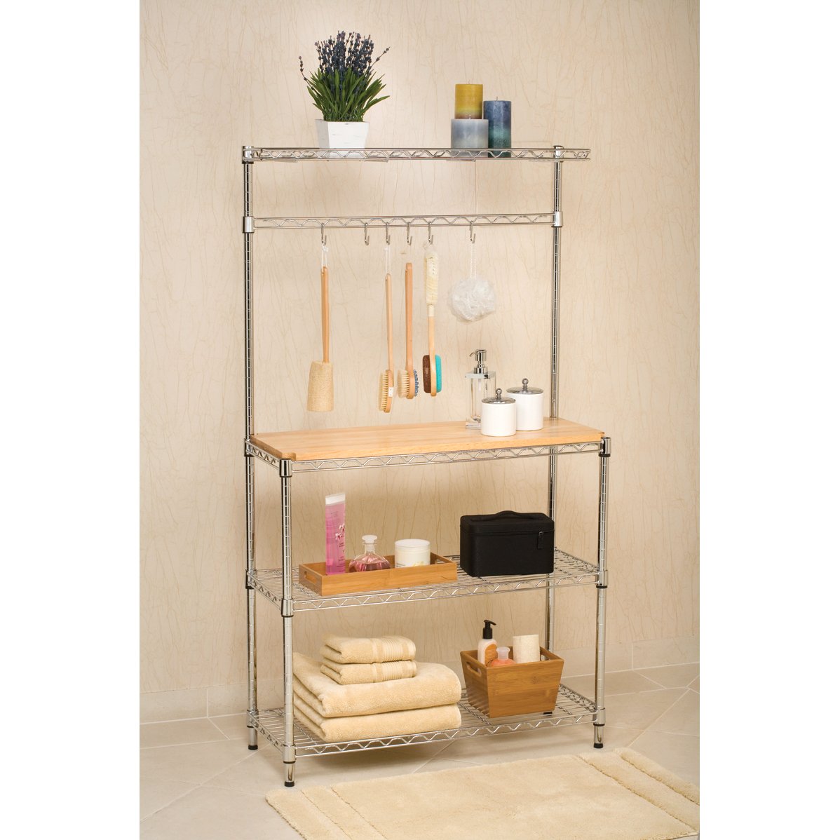 • Includes: Rubber Wood Top, 3 Shelves (14″ x 36″), 1 Cantilever Shelf (8″ x 36″) and 1 Hanging Bar (36″) with S-Hooks (6 pcs)