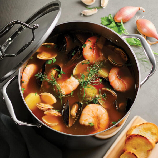 The Tramontina 8-Quart Tri-Ply Clad Stainless Steel Covered Stock Pot is a great choice for home and professional kitchens. The 8-quart capacity gives you plenty of space to cook large batches, making it perfect for family meals and meal prepping. Featuring tri-ply construction with an aluminum core surrounded by two layers of 18/10 stainless steel. This design ensures even heat distribution, reducing hot spots and giving you more control over your cooking. Create gourmet meals for 8 to 12 people with this 8-quart stock pot, perfect for crafting everything from spaghetti and soups to rich stocks and homemade broths. Designed for experienced chefs, its stainless steel lid locks in heat and moisture, making it ideal for slow-cooking exquisite soups, hearty stews, and luxurious sauces. The stock pot is NSF-certified, meeting the highest standards for safety and quality. Designed for use in both home and professional kitchens, it’s compatible with all cooktops, including gas, electric, ceramic glass, and induction. It’s oven-safe up to 500°F offering plenty of cooking options. Its sturdy handles are riveted for extra strength and make it easy to move around, even when full. This stock pot has a mirror-polished exterior that gives it a sleek, professional look, perfect for both cooking and serving. For best results, we recommend handwashing and using non-abrasive sponges, though it is also dishwasher-safe for added convenience. Whether you’re feeding your family or entertaining guests, the Tramontina stock pot is a must-have for your kitchen. It’s especially handy for boiling pasta, making it a great spaghetti pot.
