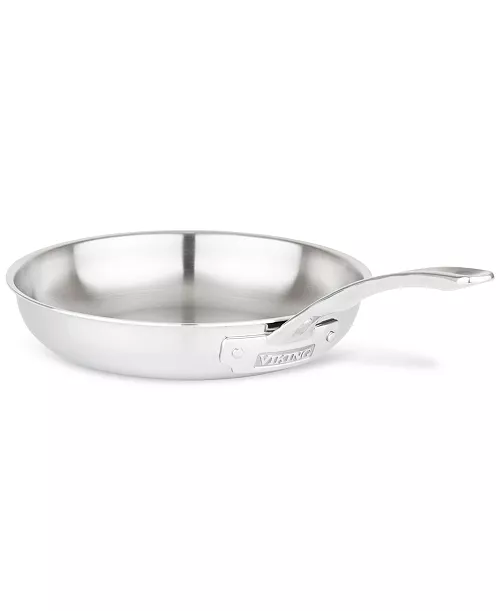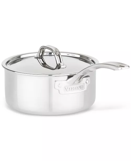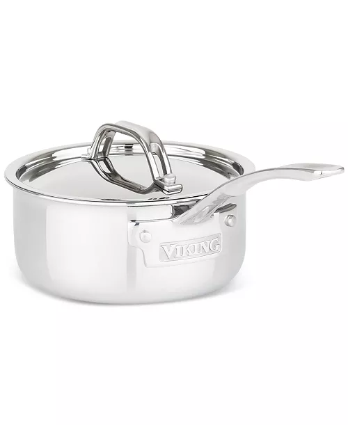 The Viking 3-Ply Stainless Steel 10-Piece Cookware Set features three layers of stainless steel and aluminum to distribute heat evenly throughout the bottom and sides of the pan. The interior of the sauce pans and sauté pans are marked with easy-to-use measurement markings to quickly measure cooking liquids. The cookware features the signature Viking solid cast stainless steel handles that are attached with stainless steel rivets for a lifetime of use. The stainless steel pans are oven, grill, and broiler safe to 600°F. This set also features swing lids. The sauté pan lid fits the 10 inch fry pan, and the 3 Qt. sauce pan lid fits the 8 inch fry pan. All of the lids and cookware are dishwasher safe, but we always recommend hand-washing to help maintain the mirror polished finish and extend the life of the cookware.